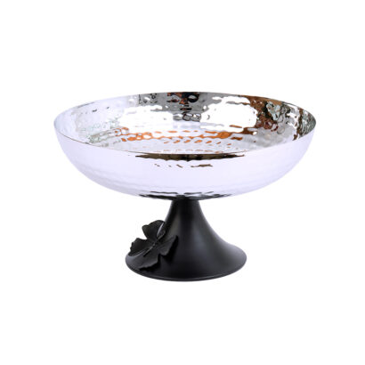 Stainless steel hand hammered metal bowl on a pedestal base with butterfly detail